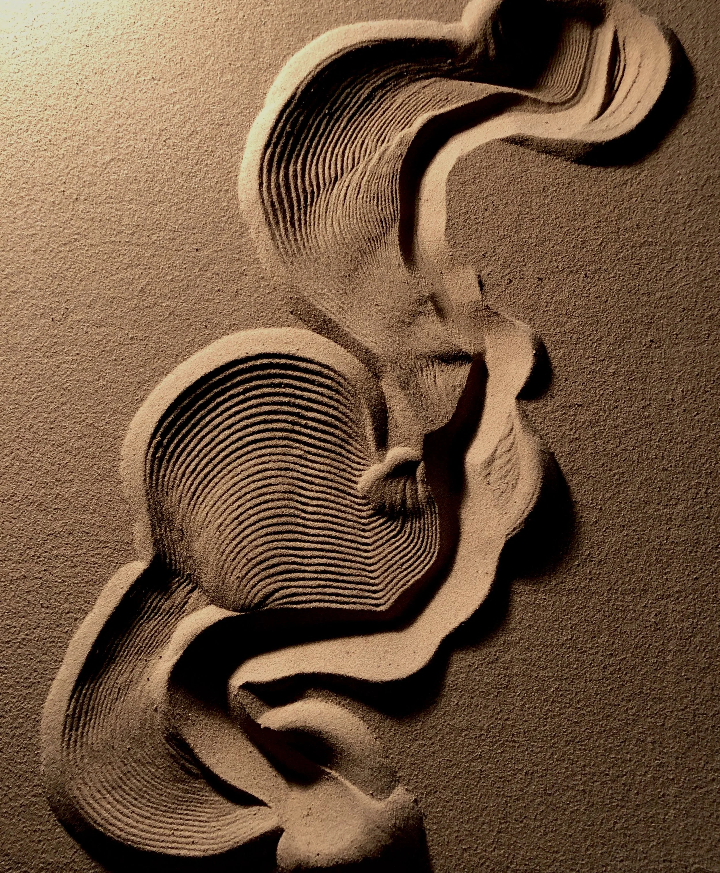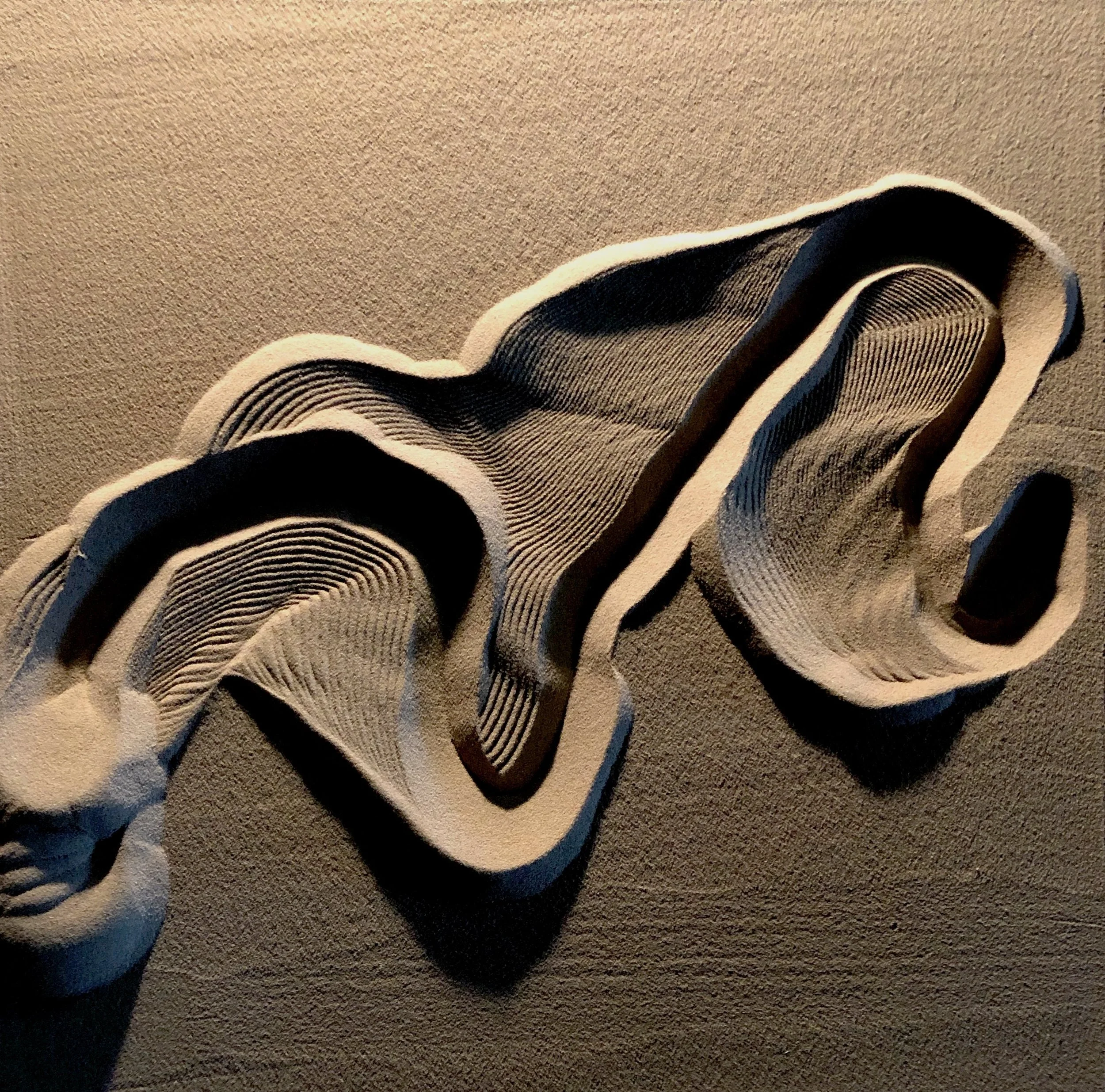 Concrete panel fabricated using an industrial robot, set with custom tool for imprinting sand. Lines and forms are from historical locations of the Mississippi River as it has meandered through time (see “Meandering Mississippi” project for more explanation). These vector lines representing river geomorphology were robotically drawn in the sand, with each line overlapping with the previous in a historically and spatially accurate manner. The sand is then sprayed with silicate in order to create a hard top crust or mold. Finally, a concrete cast was created and pulled off of the mold.