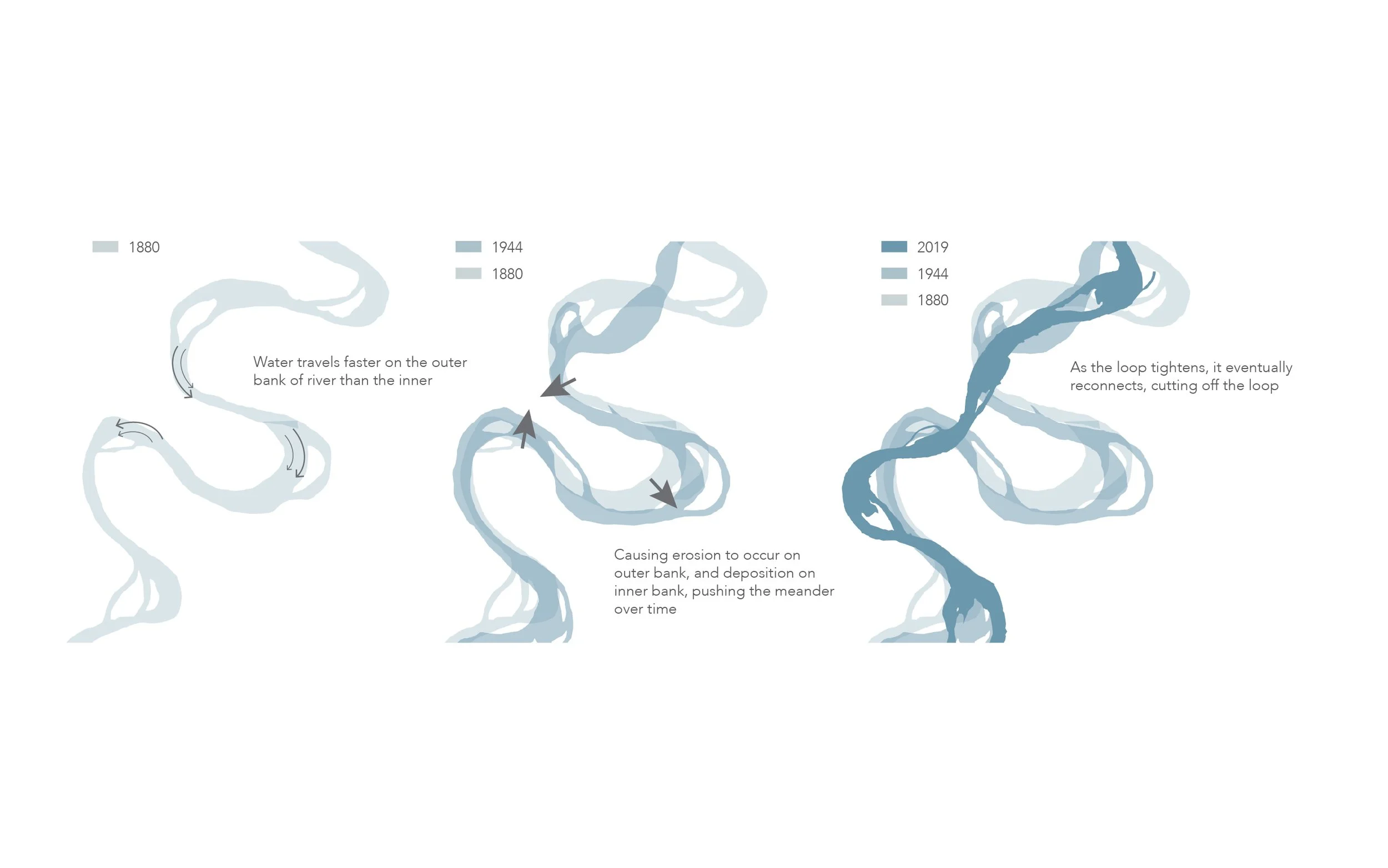 The cast concrete river meander pieces oscillate between vertical spotlighting, accentuating the form itself, and historical map projections, exposing the morphological, geopolitical, and infrastructural information that builds the form. This simple form created from a complex process helps to visualize and comprehend this larger societal conversation as we approach policy and design questions regarding climate change and reassess nature’s role in these topics.