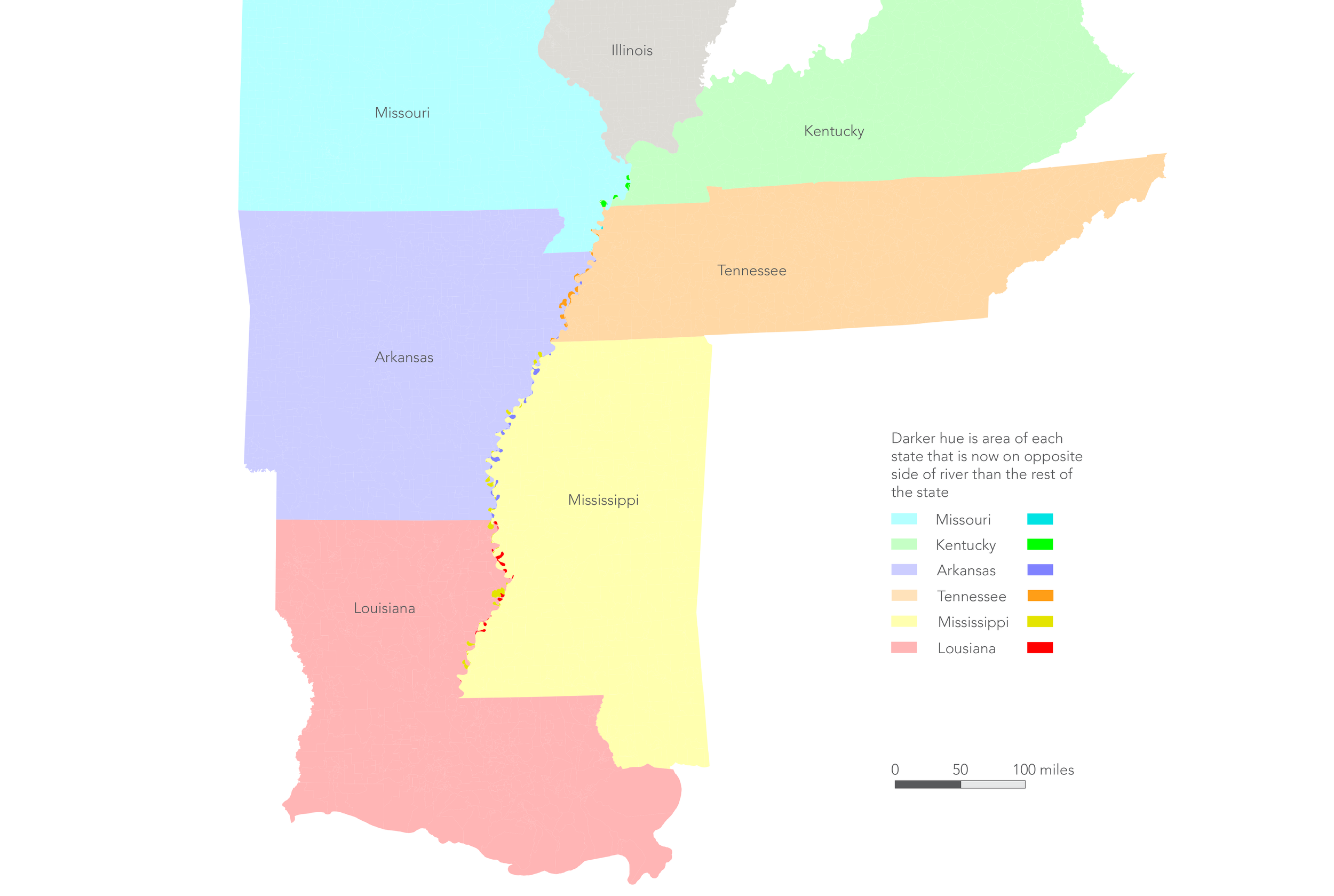 As the river’s location has changed since it was referenced to establish state lines in the early 1800s, the geopolitical boundaries have not. This has left parts of each state on the opposite side of the river from the rest of the state. These areas were calculated by taking the difference of the 2019 river location shapefile and the state shapefiles.